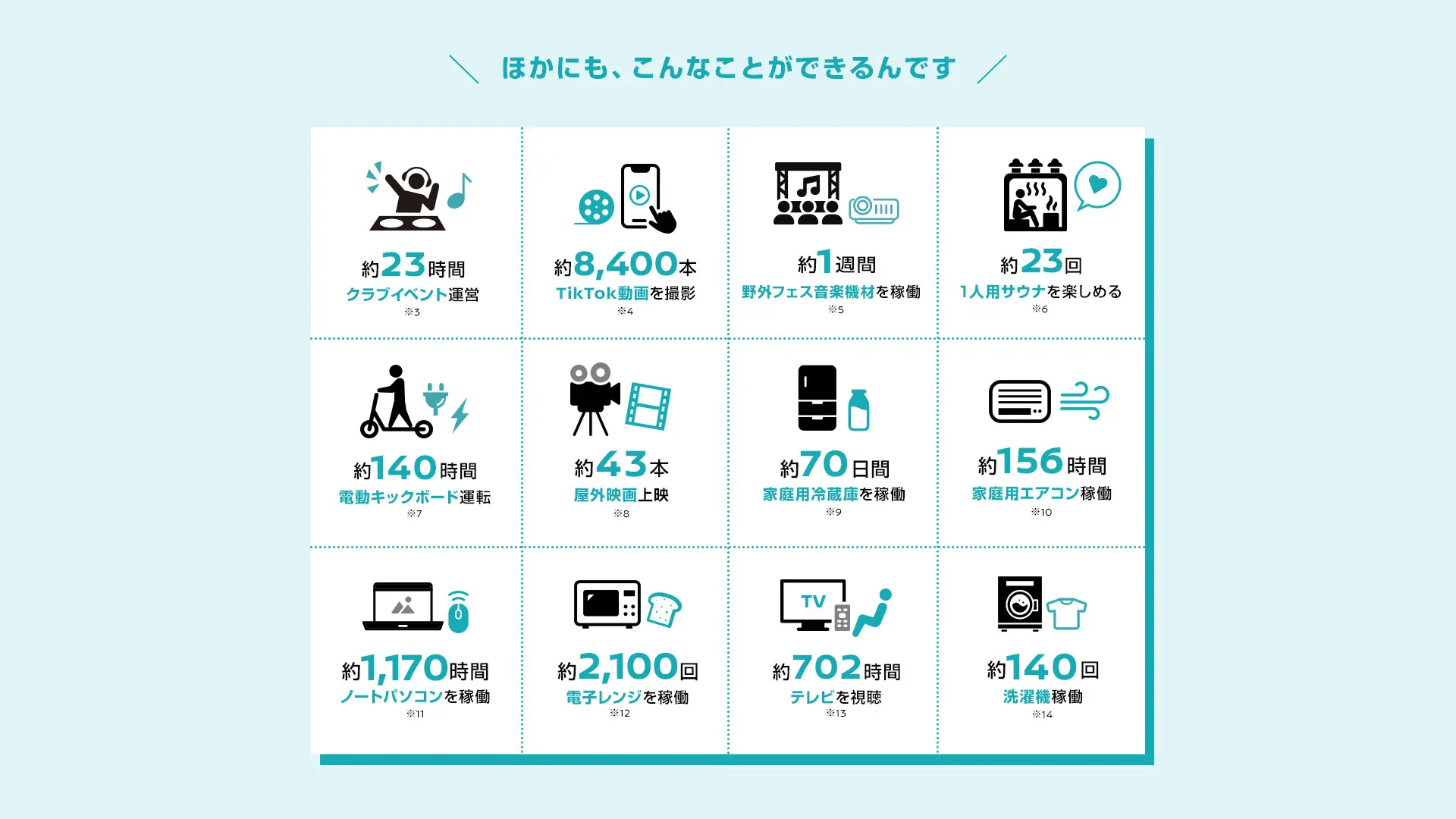 ※5 音響のみ、機材消費約1kWh、稼働10時間/日とした試算値。