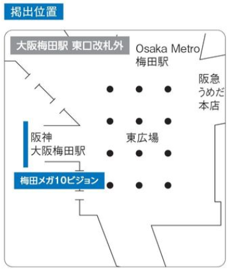 阪神線のメインターミナルである大阪梅田駅の玄関口にある大型デジタルサイネージです。